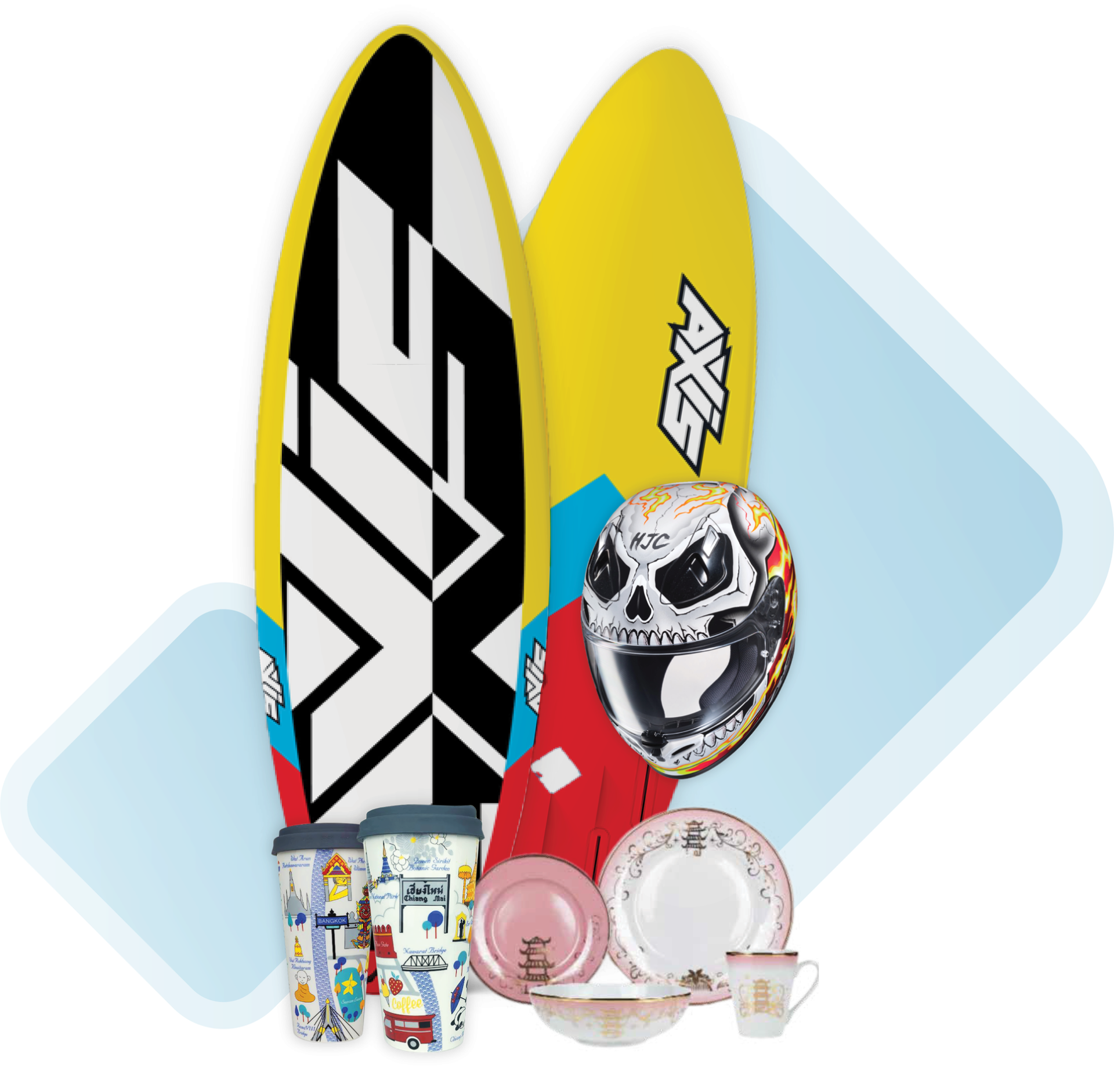 และวัสดุต่าง ๆเช่น เสื้อผ้ากีฬา, หนัง PVC, หมวก, พลาสติก และเซรามิก เป็นต้น