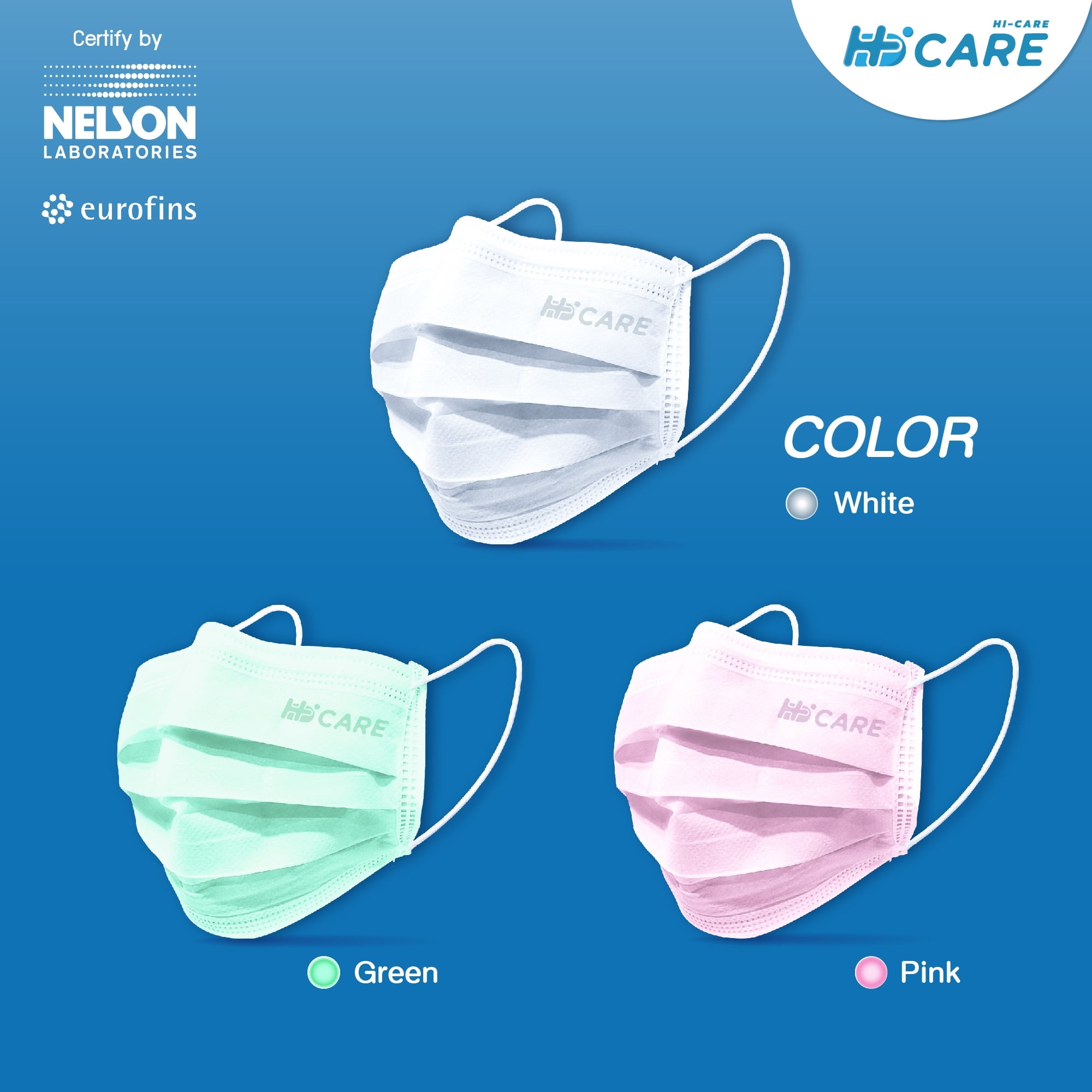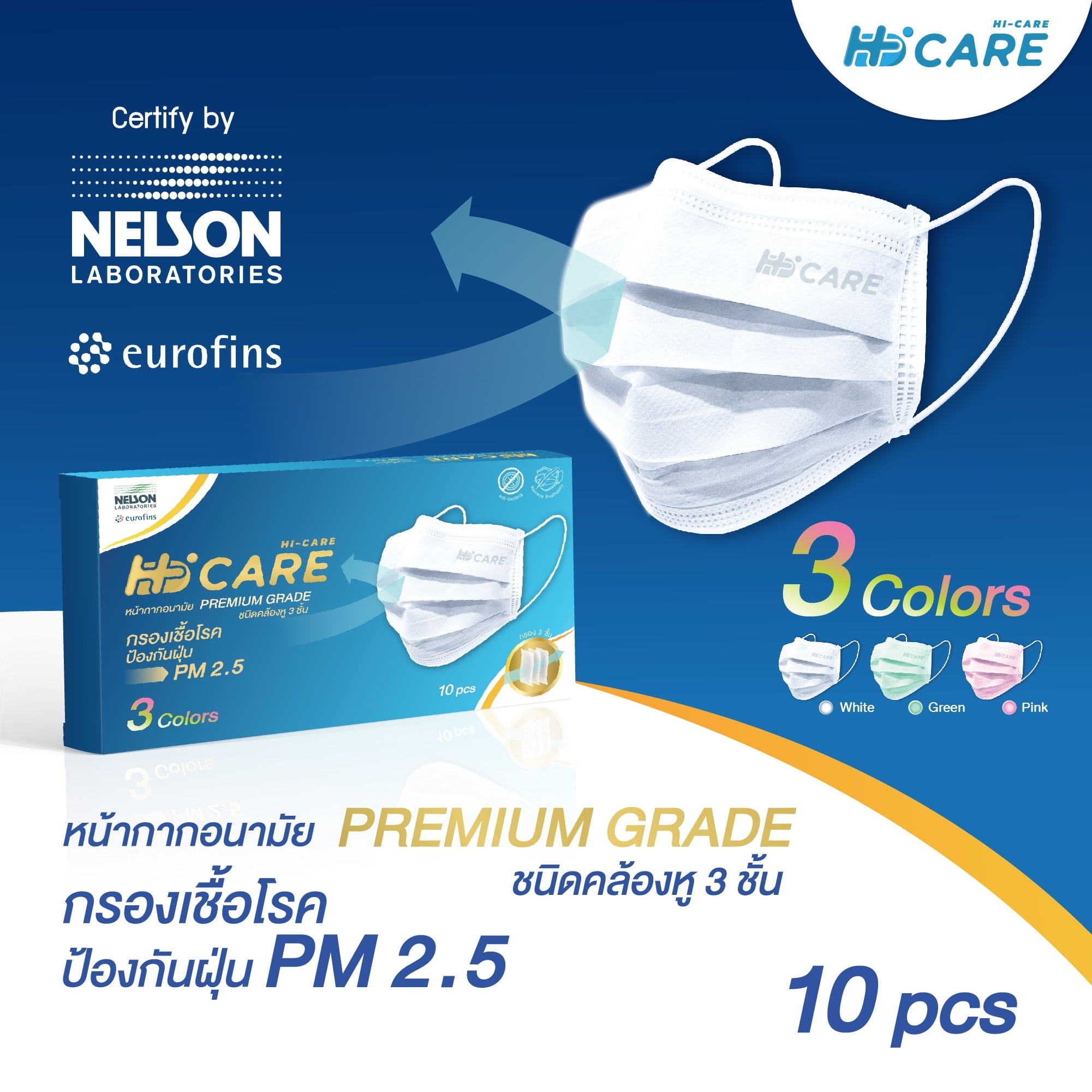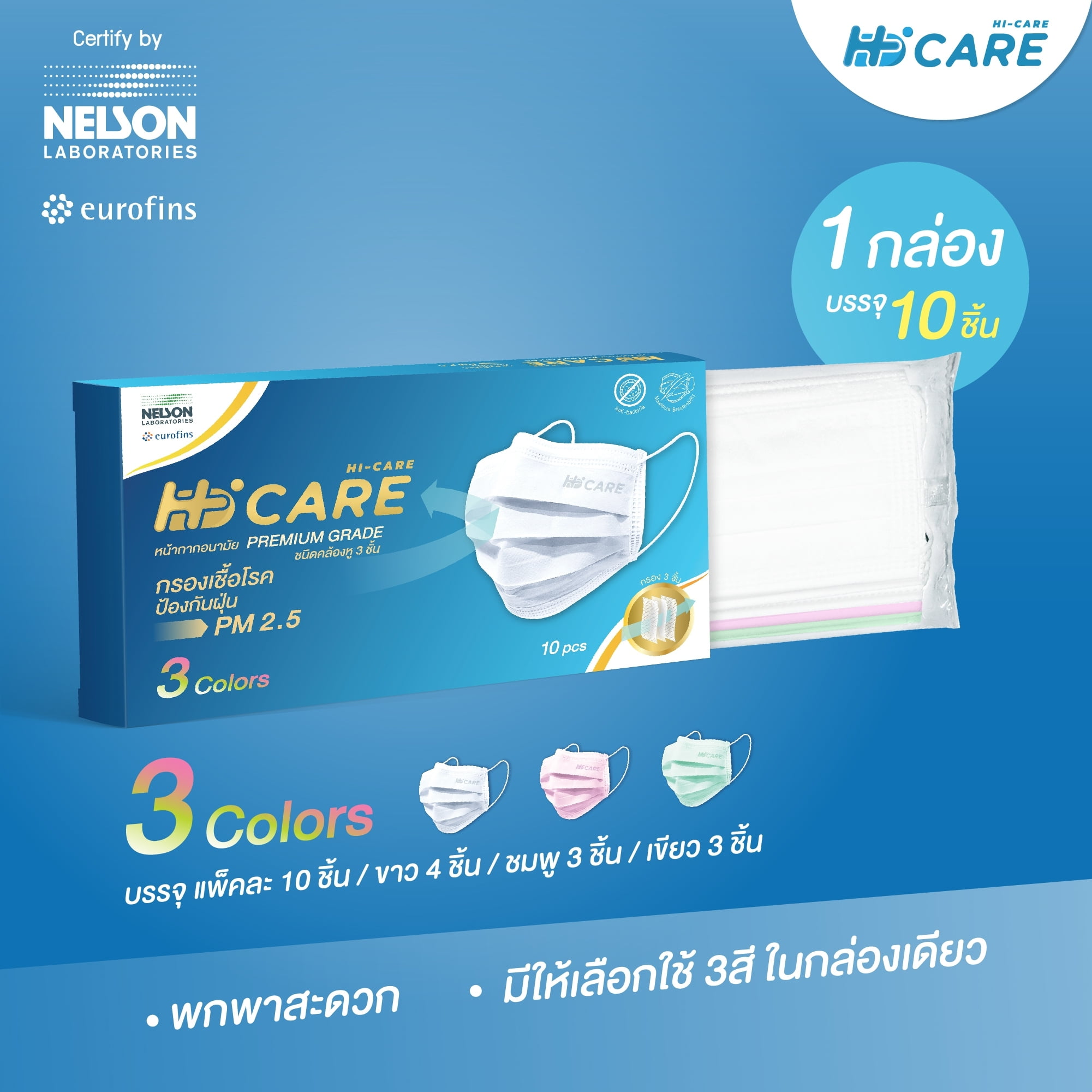 Hi-Care หน้ากากอนามัย 3 Colors (รองรับ PM2.5 กรองเชื้อโรค) แผ่นกรอง 3 ชั้น ชนิดคล้องหู / 10 ชิ้น : บรรจุ3สีในกล่องเดียว:สีขาว4ชิ้น(รุ่นPremium) / สีชมพู3ชิ้น(รุ่นAir) / สีเขียว3ชิ้น(รุ่นAir)