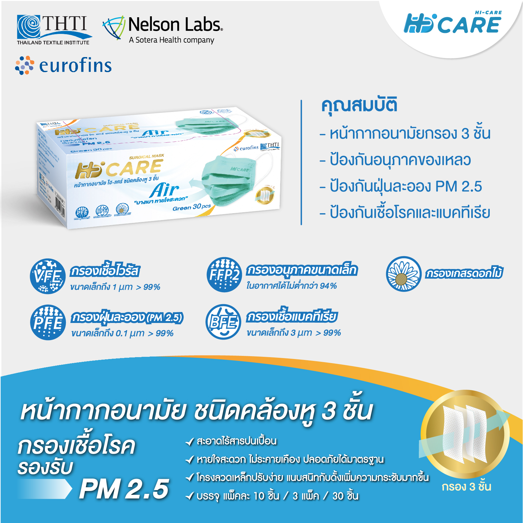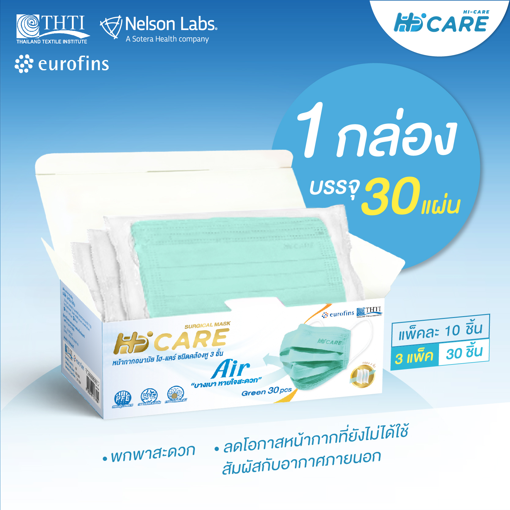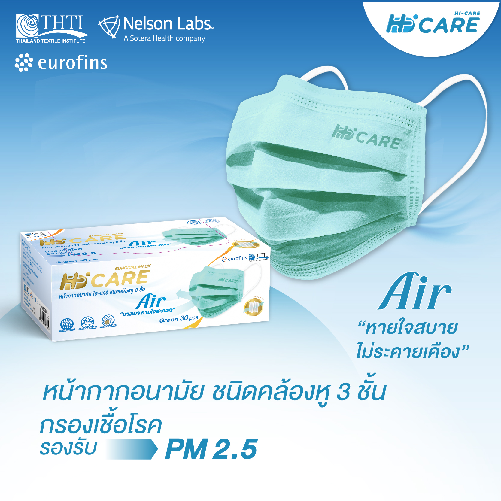 – หน้ากากอนามัย Hi-Care Air เบาสบาย หายใจสะดวก ไม่ระคายเคือง (รองรับ PM2.5 กรองเชื้อโรค) แผ่นกรอง 3 ชั้น ชนิดคล้องหู สีเขียว
