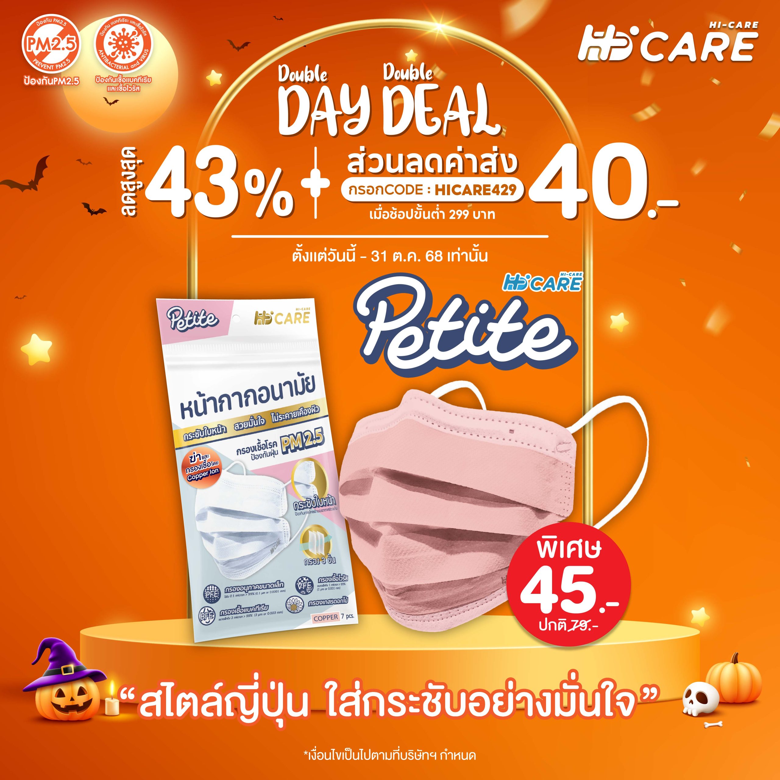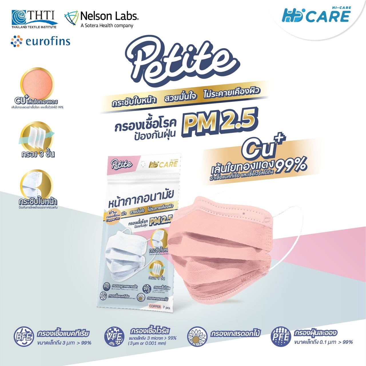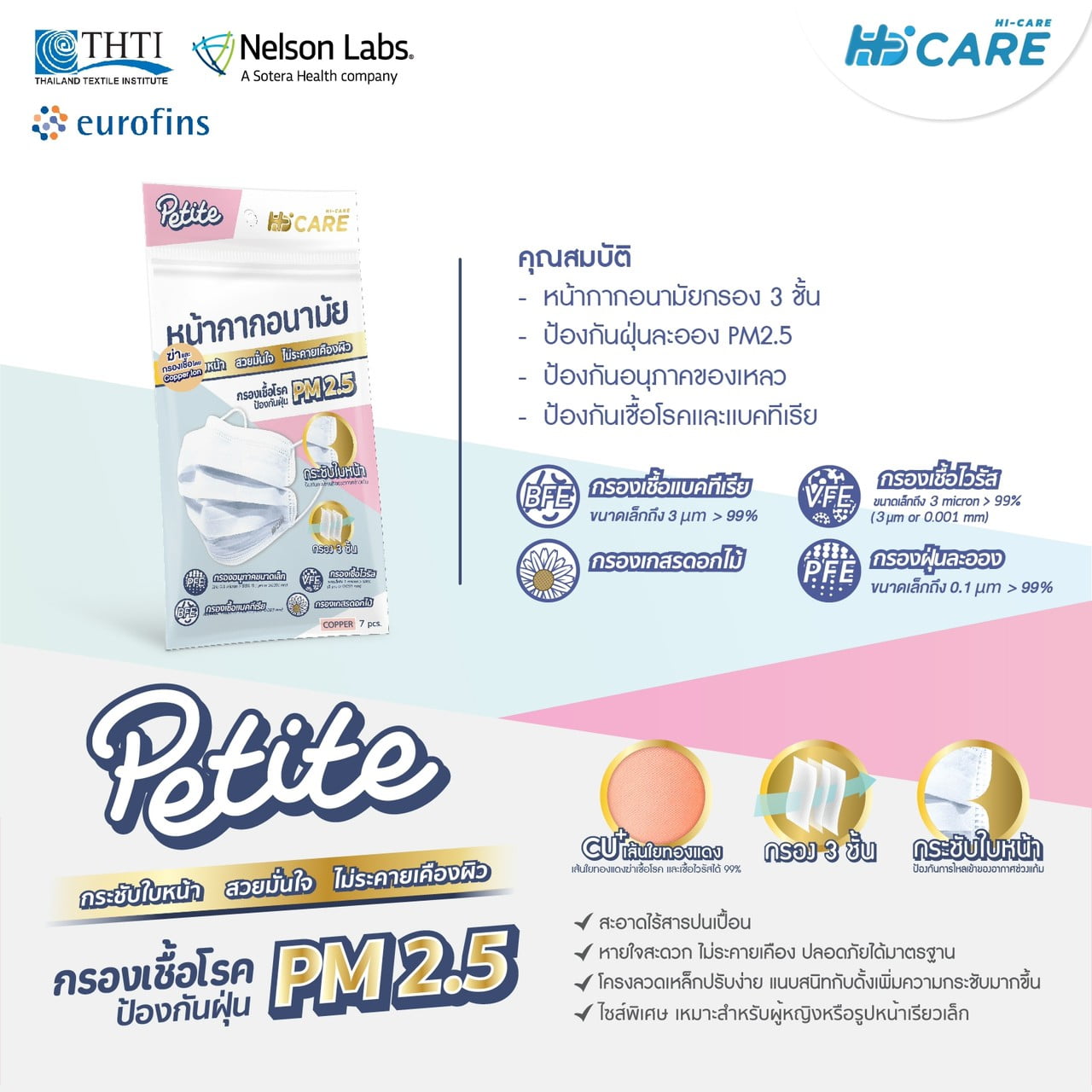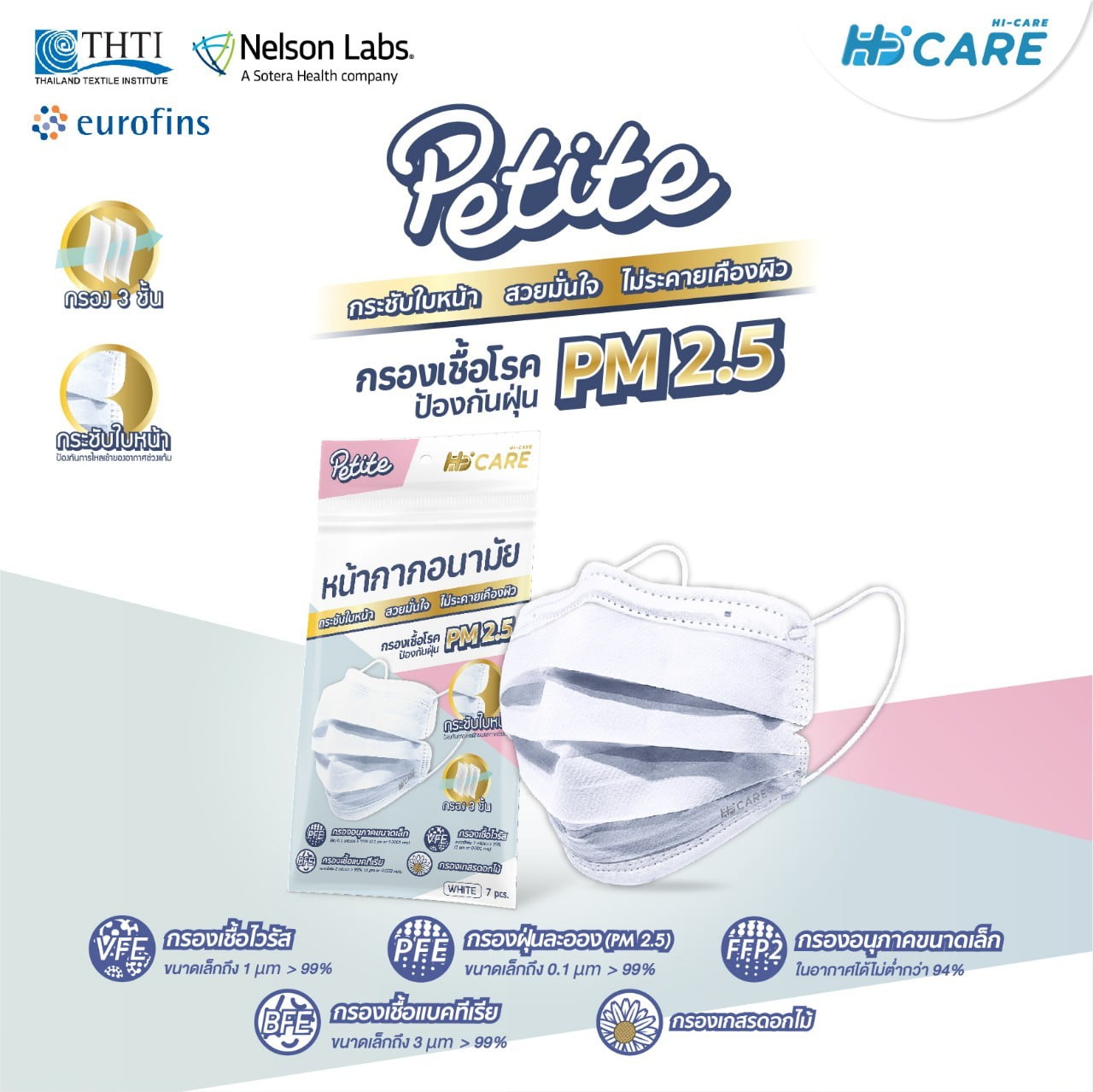 Hi-Care Petite เป็นนวัตกรรมใหม่ของหน้ากากอนามัยกระชับรูปหน้า Minimize air leak (ลดการรั่วไหลของอากาศ) ออกแบบให้กระชับบริเวณแก้มและสันจมูก เพื่อป้องกันอากาศไม่ผ่านการกรองบริเวณสันจมูกและโหนกแก้ม