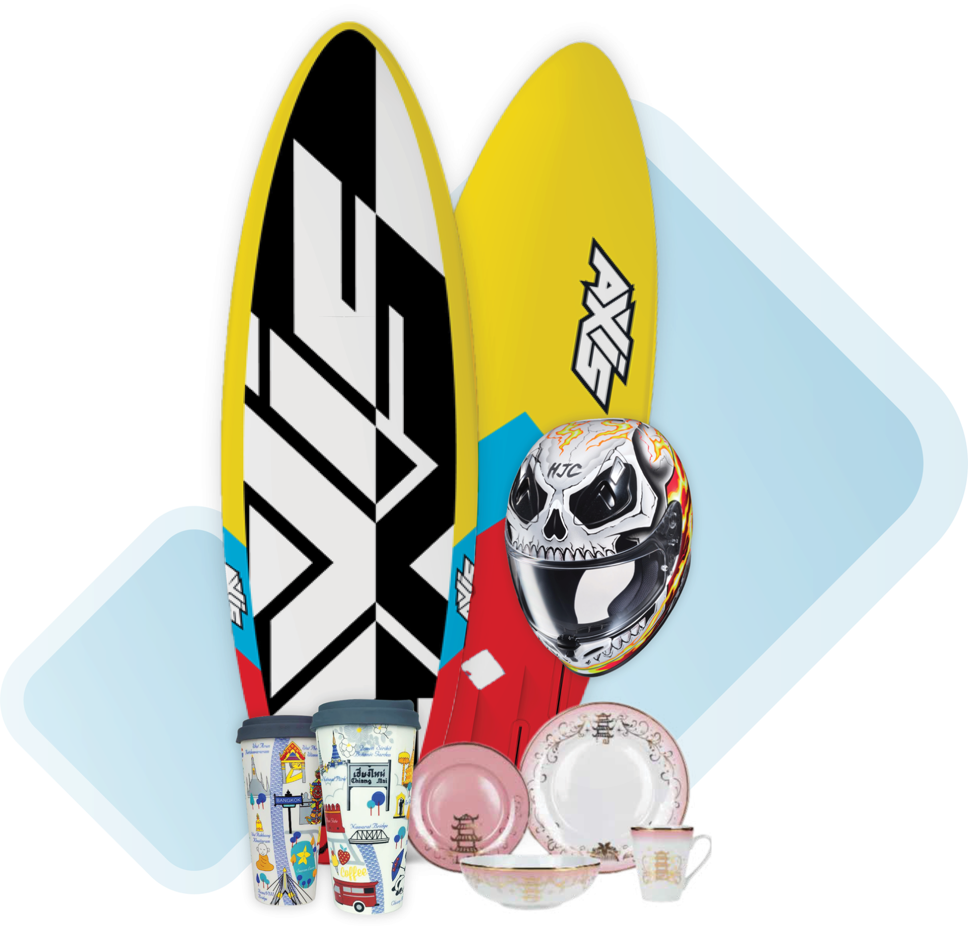 และวัสดุต่าง ๆเช่น เสื้อผ้ากีฬา, หนัง PVC, หมวก, พลาสติก และเซรามิก เป็นต้น